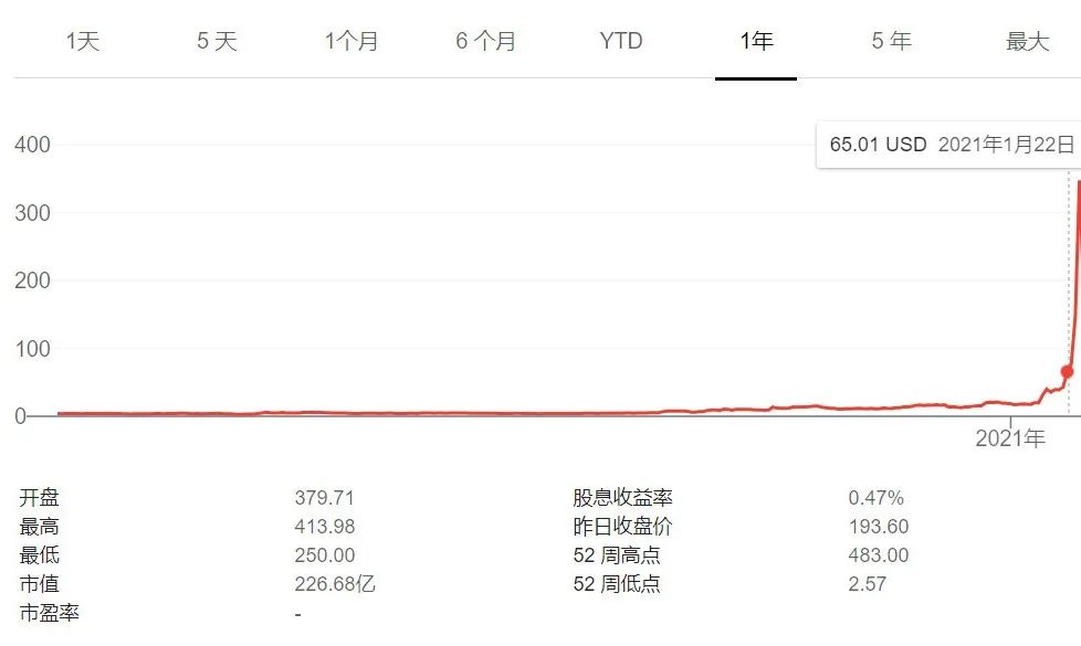 GME的股价不仅没跌到20,反而直接坐上了火箭,一飞冲天。