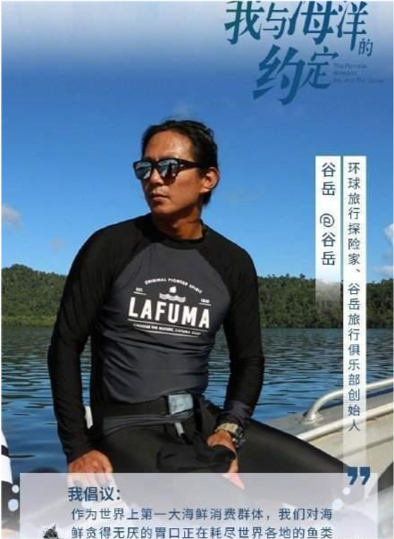 美籍华裔大V谷岳也在以中国人的口吻劝中国人少吃海鲜,一张嘴就是海洋鱼类等资源面临枯竭,中国人要以身作则。